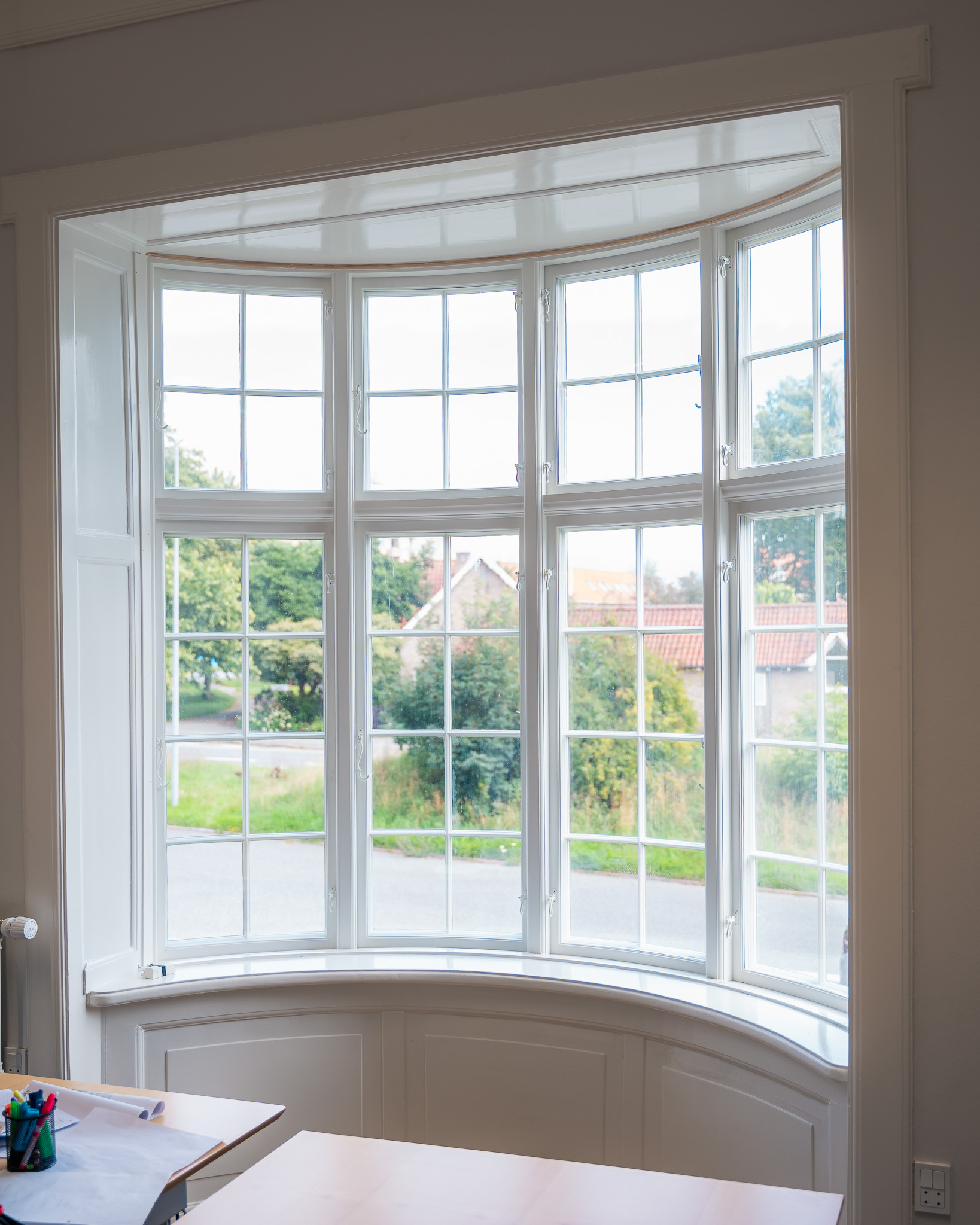 Bygningens facade er prydet med en karakteristisk karnap, der består af 8 fag og 48 ruder. Det kræver håndværksmæssig perfektion at fremstille vinduer til et cylinderformet parti. Der er nemlig ingen konkrete fikspunkter på den runde facade, og derfor var opmålingen både vanskelig og vigtig.