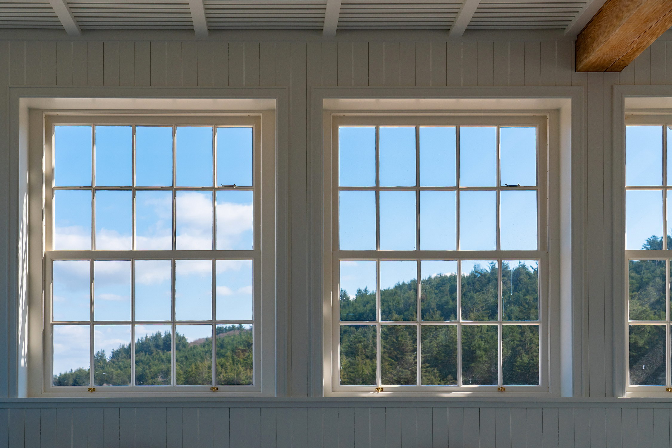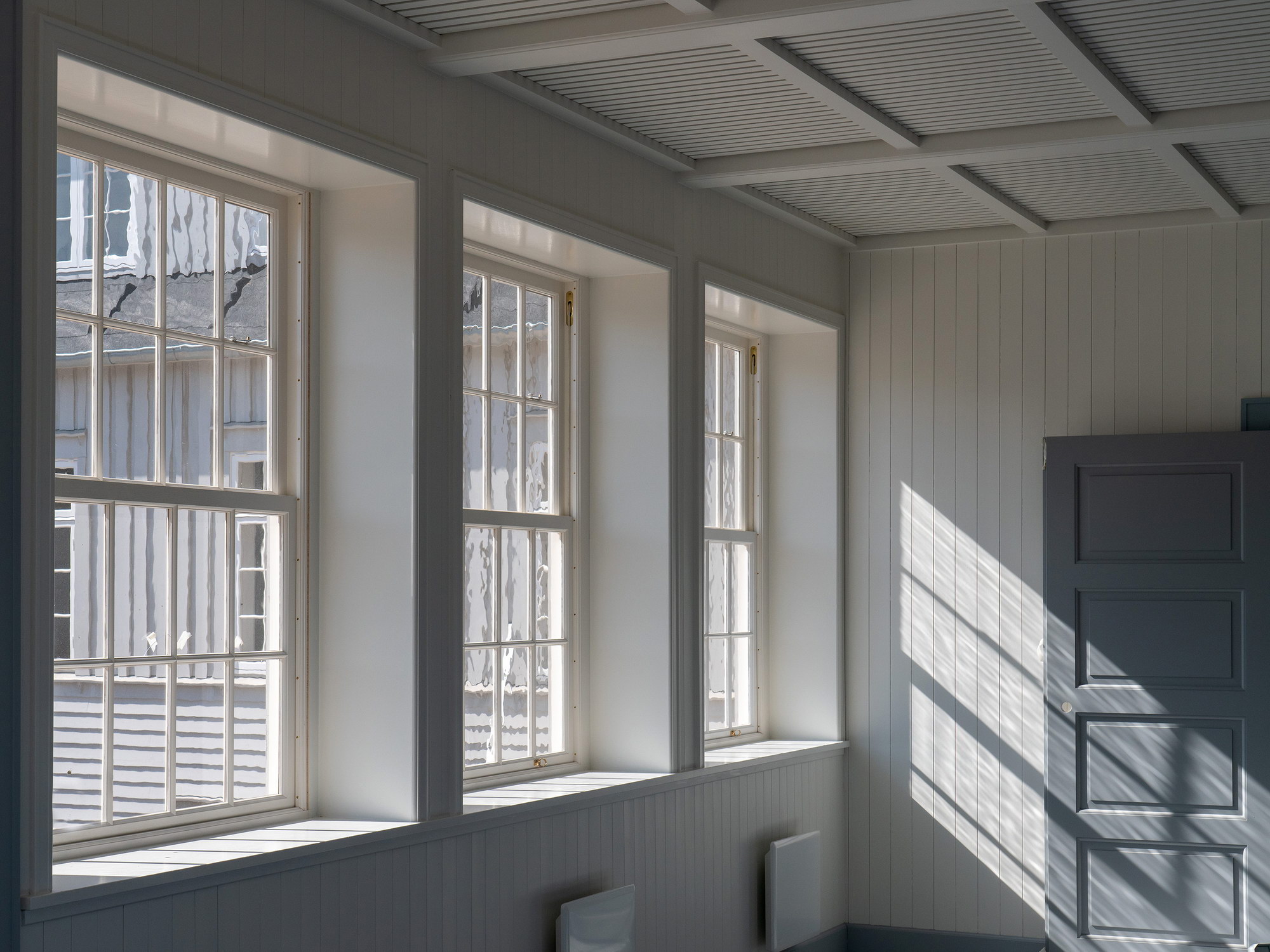 Vi leverede blandt andet 42 af de ikoniske hejsevinduer, som er kendetegnet ved, at den nederste del af vinduet let kan skubbes op bag den øverste del. Det kan det, fordi den nederste ramme er hæftet til en snor, der er bundet til to jernlodder, som trækker vinduet op, når du løfter i den nederste ramme.